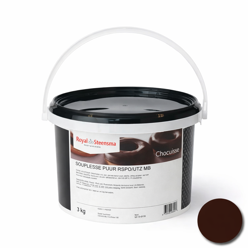 Souplesse is een flexibele chocolade coating die wordt toegepast als een product verwerkt wordt via de vriezer of koeling. De souplesses in deze range zijn RSPO (MB) gecertificeerd en vervaardigd met duurzame palmolie. De Souplesse hard uit, maar door de speciale samenstelling van vetten blijft het product flexibel en knapt het niet van uw product af. Na ontdooien van het product vormt zich geen condens op de coating.